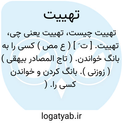 تهییت. [ ت َ ] ( ع مص ) کسی را به بانگ خواندن. ( تاج المصادر بیهقی ) ( زوزنی ). بانگ کردن و خواندن کسی را. ( منتهی الارب ) ( آنندراج ) ( ناظم الاطباء ) ( از اقرب الموارد ).