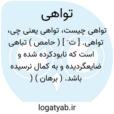 تواهی. [ ت َ ] ( حامص ) تباهی است که نابودکرده شده و ضایعگردیده و به کمال نرسیده باشد. ( برهان ) ( از ناظم الاطباء ). بمعنی تباهی است که ضایع و نابودشده باشد. ( انجمن آرا ) ( آنندراج ).