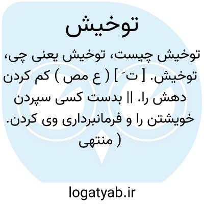 توخیش. [ ت َ ] ( ع مص ) کم کردن دهش را. || بدست کسی سپردن خویشتن را و فرمانبرداری وی کردن. ( منتهی الارب ) ( آنندراج ) ( ناظم الاطباء ) ( از اقرب الموارد ). || ردی و پست ساختن چیزی را. ( از اقرب الموارد ).