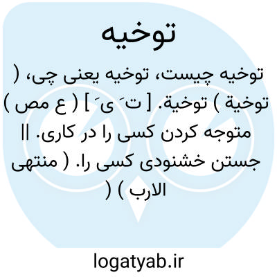 ( توخیة ) توخیة. [ ت َ ی َ ] ( ع مص ) متوجه کردن کسی را در کاری. || جستن خشنودی کسی را. ( منتهی الارب ) ( آنندراج ) ( ناظم الاطباء ) ( از اقرب الموارد ).