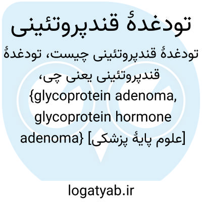 {glycoprotein adenoma, glycoprotein hormone adenoma} [علوم پایۀ پزشکی] تودغده ای در غدۀ زیرمغزی که موجب ترشح بیش از اندازۀ یکی از سه هورمون قندپروتئینی می شود