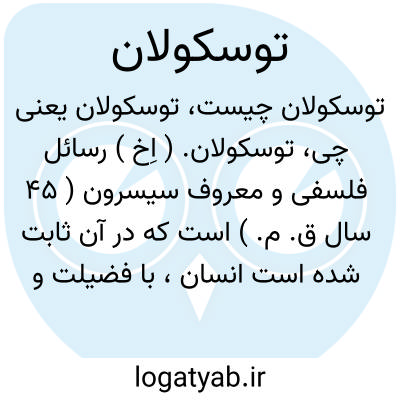 توسکولان. ( اِخ ) رسائل فلسفی و معروف سیسرون ( 45 سال ق. م. ) است که در آن ثابت شده است انسان، با فضیلت و تقوی مافوق مرگ و رنج دیگر بدیهاست. رجوع به توسکولوم شود.