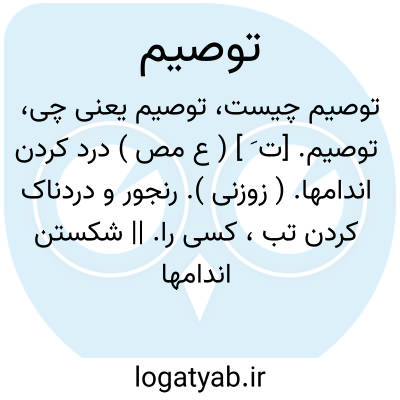 توصیم. [ت َ ] ( ع مص ) درد کردن اندامها. ( زوزنی ). رنجور و دردناک کردن تب، کسی را. || شکستن اندامها وسست شدن. ( منتهی الارب ) ( ناظم الاطباء ) ( آنندراج ) ( ازاقرب الموارد ). || سست و کسل شدن. ( از اقرب الموارد ). || ( اِ ) گرانی و سستی و کاهلی. ( منتهی الارب ) ( آنندراج ) ( ناظم الاطباء ). شکستگی اندام. ( ناظم الاطباء ): لاتوصیم فی الدین؛ ای لاتفتروا فی اقامة الحدود و لاتحابوا فیها. ( از اقرب الموارد ).