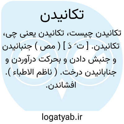 تکانیدن. [ ت َ دَ ] ( مص ) جنبانیدن و جنبش دادن و بحرکت درآوردن و جنابانیدن درخت. ( ناظم الاطباء ). افشاندن. تکاندن. تکان دادن. چنانکه گستردنی یا جامه ای را افشاندن تا گرد آن یا آب آن بریزد. ( یادداشت بخط مرحوم دهخدا ). و رجوع به تکان و تکان دادن شود.