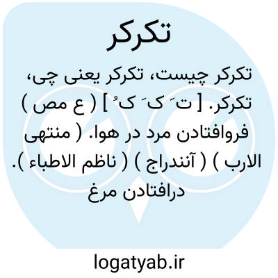 تکرکر. [ ت َ ک َ ک ُ ] ( ع مص ) فروافتادن مرد در هوا. ( منتهی الارب ) ( آنندراج ) ( ناظم الاطباء ). درافتادن مرغ در هوا. ( از اقرب الموارد ). || دودله شدن مرد در کار خود. ( منتهی الارب ) ( آنندراج ) ( ناظم الاطباء ) ( از اقرب الموارد ).