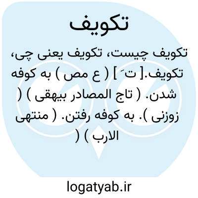 تکویف.[ ت َ ] ( ع مص ) به کوفه شدن. ( تاج المصادر بیهقی ) ( زوزنی ). به کوفه رفتن. ( منتهی الارب ) ( ناظم الاطباء ) ( آنندراج ) ( از اقرب الموارد ). || بریدن. ( منتهی الارب ) ( آنندراج ) ( ناظم الاطباء ). بریدن ادیم را. ( از اقرب الموارد ). || کاف نوشتن. ( منتهی الارب ) ( آنندراج ) ( ناظم الاطباء ) ( از اقرب الموارد ).