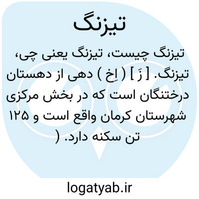تیزنگ. [ زَ ] ( اِخ ) دهی از دهستان درختنگان است که در بخش مرکزی شهرستان کرمان واقع است و 125 تن سکنه دارد. ( از فرهنگ جغرافیایی ایران ج 8 ).