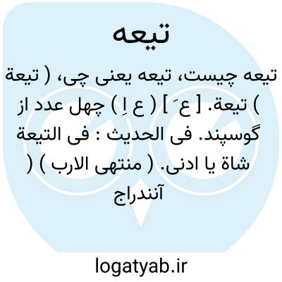 ( تیعة ) تیعة. [ ع َ ] ( ع اِ ) چهل عدد از گوسپند. فی الحدیث: فی التیعة شاة یا ادنی. ( منتهی الارب ) ( آنندراج ) ( ناظم الاطباء ) ( از اقرب الموارد ). || آن قدر از حیوان که در زکوة واجب باشد. کاءَنها الجملة التی للسعاة الیها سبیل من تاع الیه؛ ای ذهب. ( منتهی الارب ) ( از ناظم الاطباء ) ( از اقرب الموارد ) ( از آنندراج ).