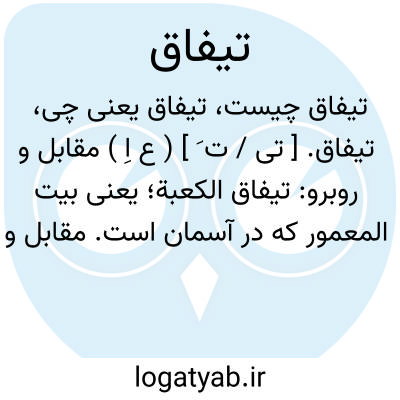 تیفاق. [ تی / ت َ ] ( ع اِ ) مقابل و روبرو: تیفاق الکعبة؛ یعنی بیت المعمور که در آسمان است. مقابل و محاذی خانه کعبه است. ( ازمنتهی الارب ) ( از ناظم الاطباء ) ( از اقرب الموارد ).