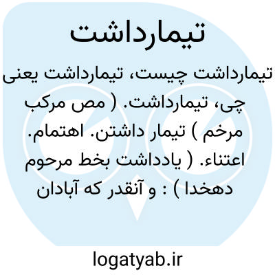 تیمارداشت. ( مص مرکب مرخم ) تیمار داشتن. اهتمام. اعتناء. ( یادداشت بخط مرحوم دهخدا ): و آنقدر که آبادان ماندست از حرمت خاندان این قاضی پارس و تیمارداشت او بودست. ( فارسنامه ابن البلخی ص 134 ) کفشگر... قوم را در معنی تیمارداشت او وصایت فرمود. ( کلیله و دمنه ).. و بنیادی که اسلاف... نهادند بر آن برود و تیمارداشت رعیتان و عمارت جهان پیشه گیرد. ( راحةالصدور راوندی ). به تقدیم لطف برعایت مهمات... و تیمارداشت رعیت نام نیک اندوخت. ( ترجمه تاریخ یمینی ). هر دو برادر و روانشاه و علی با خدمت اصفهبد آمدند برهنه و از ملک برآمده هر دو را نان پدید کرد و تیمارداشت می فرمود. ( تاریخ طبرستان ). و او در تیمارداشت و شفقت در احوال اردشیرشاه بغایتی بود که وراء آن نتوان بود. ( از تاریخ طبرستان ). || مهتری اسبان. ( ناظم الاطباء ): و این مرد تیمارداشت آن گوسفندان و اسبان می کند. ( فیه مافیه ). رجوع به تیمار و دیگر ترکیبهای آن شود.