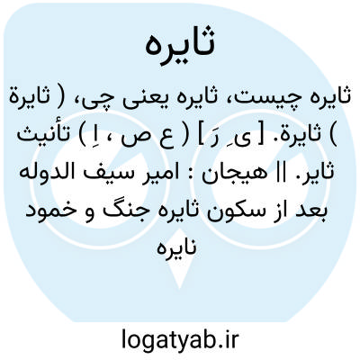 ( ثایرة ) ثایرة. [ ی ِ رَ ] ( ع ص، اِ ) تأنیث ثایر. || هیجان: امیر سیف الدوله بعد از سکون ثایره جنگ و خمود نایره حرب او را امان داد. ( ترجمه تاریخ یمینی ص 159 ).