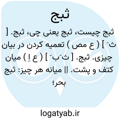 ثبج. [ ث َب َ ] ( ع اِ ) میان کتف و پشت. || میانه هر چیز: ثبج بحر؛ میانه دریا و معظم بحر. || سینه سنگخوار یعنی سینه اسفرود. || مرغ حق. شب آهنگ. || مرغی است. ج، اَثباج.