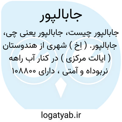 لغت نامه دهخدا جابالپور. ( اِخ ) شهری از هندوستان ( ایالت مرکزی ) در کنار آب راهه نربوداه و آمتی، دارای 108800 تن سکنه و کرسی ایالتی بهمین نام دارای کارخانه های فرش و منسوجات و تجارت آن رونقی دارد ایالت مزبور 2396000 تن سکنه دارد.