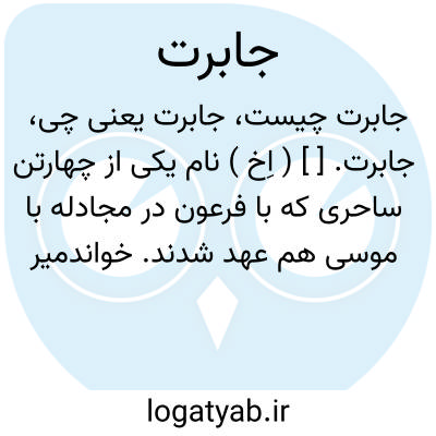 جابرت. [ ] ( اِخ ) نام یکی از چهارتن ساحری که با فرعون در مجادله با موسی هم عهد شدند. خواندمیر نویسد: سحره بعقیده محمدبن جریر الطبری چهار تن بودند بنام: شابرت، جابرت، حظحظة، و مصفر.( حبیب السیر چ سنگی طهران جزو اول از ج اول ص 32 ). جابرة. [ ب ِ رَ ] ( ع ص ) تأنیث جابر. || ظالمانه، ستمگرانه، جابرانه: امور دواوین و قوانین در سلک نظام آوردو رسوم جابره برانداخت. ( ترجمه تاریخ یمینی ص 42 ). جابرة. [ ب ِ رَ ] ( اِخ ) نام مدینه منوره است. ( منتهی الارب ). رجوع به مدینه شود.