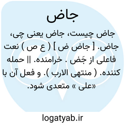 لغت نامه دهخدا جاض. [ جاض ض ] ( ع ص ) نعت فاعلی از جَض. خرامنده. || حمله کننده. ( منتهی الارب ). و فعل آن با «علی » متعدی شود. یقال: جض علیه بالسیف. || سخت دونده. ( منتهی الارب ).