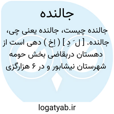 جالنده. [ ل َ دِ ] ( اِخ ) دهی است از دهستان دربقاضی بخش حومه شهرستان نیشابور و در 6 هزارگزی خاور نیشابور واقع است. محلی جلگه و هوای آن معتدل است. 364 تن سکنه دارد. مذهب آنان شیعه و زبان آنها فارسی است. آب از قنات و محصول آن غلات است. شغل اهالی زراعت و مالداری است راه آنجا مالرو است. ( از فرهنگ جغرافیایی ایران ج 9 ).