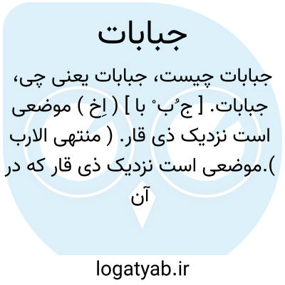 جبابات. [ ج ُب ْ با ] ( اِخ ) موضعی است نزدیک ذی قار. ( منتهی الارب ).موضعی است نزدیک ذی قار که در آن جنگی بین بکربن وائل و فارسیان رخ داد. ( معجم البلدان ) ( مراصدالاطلاع ). اماالجبابات فقد غشینا بفاقرات تحت فاقرینا.الاغلب ( از معجم البلدان ). جبابات. [ ج ُ ] ( اِخ ) آبی است در نزدیکی یمامة. ( از معجم البلدان ).