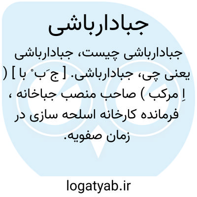 جبادارباشی. [ ج َب ْ با ] ( اِ مرکب ) صاحب منصب جباخانه، فرمانده کارخانه اسلحه سازی در زمان صفویه. در سازمان اداری حکومت صفوی چنین آمده است: جبادارباشی نیز از خواجه سرایان بود و چلنگران و کارگران و پیکانگران و باروت سازان و آتشباران و کارگران مسگرخانه جزء ابوابجمعی او بودند. ( از سازمان اداری حکومت صفوی ص 126 ).
