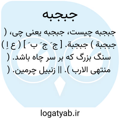 ( جبجبة ) جبجبة. [ ج َ ج َ ب َ ] ( ع اِ ) سنگ بزرگ که بر سر چاه باشد. ( منتهی الارب ). || زنبیل چرمین. ( منتهی الارب ) ( آنندراج ). || شکنبه. ( منتهی الارب ) ( غیاث اللغات از نصاب ). || پوست پهلوی شتر که آنرا از گوشت قیمه و روغن گوسپند و مانند آن پر سازند. ( منتهی الارب ). || چیزی است از پوست و جز آن که بر آن شتر را آب و دانه حنظل تر نهند. ( منتهی الارب ). || ( مص ) سیاحت کردن در زمین. || ( اِخ )بقیعالجَبْجَبة موضعی است در مدینه. این روایت سهلیست و ابن اثیر بدو خاء معجمه گفته و مشهور بتقدیم خاء معجمه بر جیم است. ( منتهی الارب ) ( از ناظم الاطباء ).