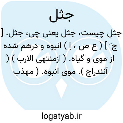 جثل. [ ج َ ] ( ع ص، اِ ) انبوه و درهم شده از موی و گیاه. ( ازمنتهی الارب ) ( آنندراج ). موی انبوه. ( مهذب الاسماء ). || سطبر کوتاه از موی و گیاه. || سطبر سیاه از موی و گیاه. || سطبر کثیف درهم شده از هر چیزی. ( از منتهی الارب ) ( آنندراج ).