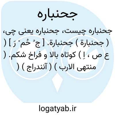 ( جحنبارة ) جحنبارة. [ ج ُ حُم ْ رَ ] ( ع ص، اِ ) کوتاه بالا و فراخ شکم. ( منتهی الارب ) ( آنندراج ) ( ذیل اقرب الموارد ). جِحِنبارَة در تمام معانی.( از منتهی الارب ) ( ذیل اقرب الموارد ). جِحِنبار. و جُحُنبار. ( منتهی الارب ). و رجوع به جِحِنبارَة شود.