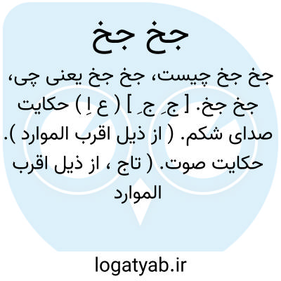 جخ جخ. [ ج ِ ج ِ ] ( ع اِ ) حکایت صدای شکم. ( از ذیل اقرب الموارد ). حکایت صوت. ( تاج، از ذیل اقرب الموارد ).، جخجخ.[ ج َ ج َ ] ( اِخ ) عبیداﷲبن احمد نحوی، مکنی به ابوالفتح. او راست: اخبار جخطة برمکی. ( از کشف الظنون ).