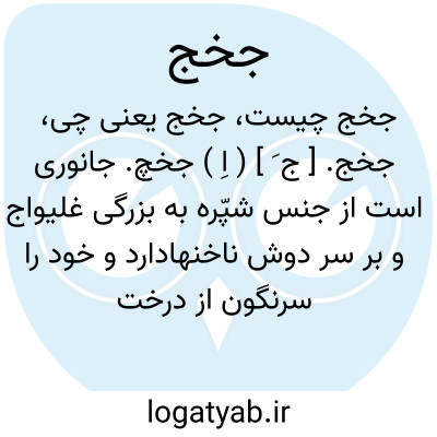 جخج. [ ج َ ] ( اِ ) جخچ. جانوری است از جنس شپّره به بزرگی غلیواج و بر سر دوش ناخنهادارد و خود را سرنگون از درخت آویزد و فضله و سرگین خود را خورد. ( برهان ) ( از انجمن آرا ). نام جانوری است مانند شپره که بکلانی غلیواژ باشد و خود را سرنگون از دندان بیاویزد، گویند که سرگین خود را بخورد و خرپیوار نیز نامند. ( از فرهنگ جهانگیری ):