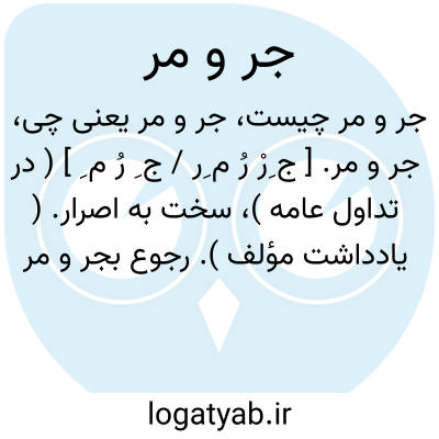 جر و مر. [ ج ِرْ رُ م ِر / ج ِ رُ م ِ ] ( در تداول عامه )، سخت به اصرار. ( یادداشت مؤلف ). رجوع بجر و مر چسبیدن شود.