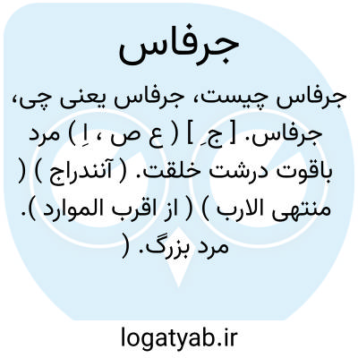 جرفاس. [ ج ِ ] ( ع ص، اِ ) مرد باقوت درشت خلقت. ( آنندراج ) ( منتهی الارب ) ( از اقرب الموارد ). مرد بزرگ. ( مهذب الاسماء ). جُرافِس. ( از اقرب الموارد ).ج، جَرافیس. ( منتهی الارب ) ( مهذب الاسماء نسخه خطی ). || شتر بزرگ. ( منتهی الارب ) ( از اقرب الموارد ) ( آنندراج ). جُرافِس. ( اقرب الموارد ). || شیر درنده. ( منتهی الارب ) ( از اقرب الموارد ) ( آنندراج ). جُرافِس. ( اقرب الموارد ). رجوع بجرافس شود.