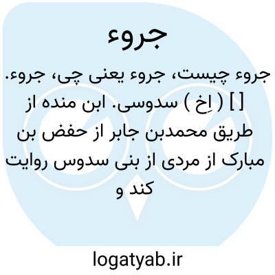 لغت نامه دهخدا جروء. [ ] ( اِخ ) سدوسی. ابن منده از طریق محمدبن جابر از حفض بن مبارک از مردی از بنی سدوس روایت کند و این شخص را جروء خوانند. رجوع به الاصابة شود.