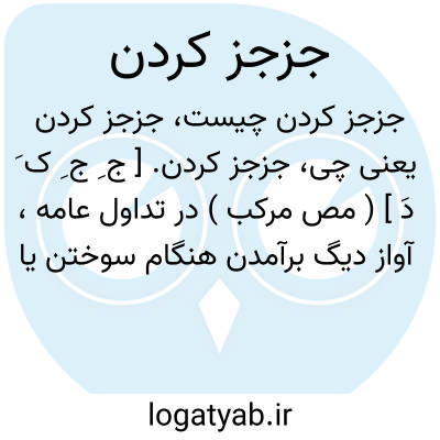 جزجز کردن. [ ج ِ ج ِ ک َ دَ ] ( مص مرکب ) در تداول عامه، آواز دیگ برآمدن هنگام سوختن یا بریان کردن گوشت یا دنبه در آن. ( از یادداشت مؤلف ). برآمدن ِ صدای تف دادن یا بریان کردن گوشت یا پیازداغ.