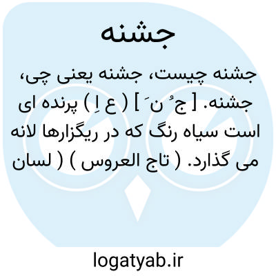 لغت نامه دهخدا جشنه. [ ج ُ ن َ ] ( ع اِ ) پرنده ای است سیاه رنگ که در ریگزارها لانه می گذارد. ( تاج العروس ) ( لسان العرب ). نام مرغی است. ( منتهی الارب ).جشنه. [ ج ُ ش ُن ْ ن َ ] ( ع اِ ) نام مرغی است. ( منتهی الارب ). ظاهراً صورتی دیگر از جشنه به تخفیف نون است.