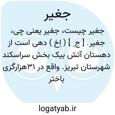 جغیر. [ ج ِ ] ( اِخ ) دهی است از دهستان آتش بیک بخش سراسکند شهرستان تبریز. واقع در 31هزارگزی باختر سراسکند و 15هزارگزی شوسه راه تبریز به میانه کوهستانی و هوای آن معتدل است و 265 تن سکنه دارد. آب آن از چشمه و رودخانه و محصول آن غلات و حبوبات و پنبه و شغل اهالی زراعت و گله داری است.راه مالرو دارد. ( از فرهنگ جغرافیائی ایران ج 4 ).