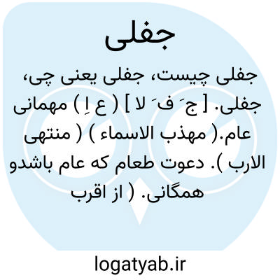 جفلی. [ ج َ ف َ لا ] ( ع اِ ) مهمانی عام.( مهذب الاسماء ) ( منتهی الارب ). دعوت طعام که عام باشدو همگانی. ( از اقرب الموارد ). سفره عام. میهمانی وضیافتی که همگانی باشد: دعاهم الجفلی؛ یعنی ایشان را بجماعت و بطور همگانی به میهمانی خواند. مقابل نَقَری ̍، یعنی دعوت خاصه، دعوتی که شامل همگان نباشد.