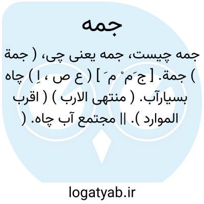 ( جمة ) جمة. [ ج َم ْ م َ ] ( ع ص، اِ ) چاه بسیارآب. ( منتهی الارب ) ( اقرب الموارد ). || مجتمع آب چاه. ( اقرب الموارد ). || جماعتی انبوه از مردمان که دیت خواهند. ( منتهی الارب ): جاؤوا فی جمة عظیمة؛ یعنی در جماعت بسیار که دیت خواهند. ( اقرب الموارد ).