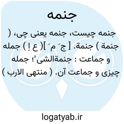 ( جنمة ) جنمة. [ ج َ م َ ]( ع اِ ) جمله و جماعت: جنمةالشی ٔ؛ جمله چیزی و جماعت آن. ( منتهی الارب ) ( ناظم الاطباء ) ( اقرب الموارد ).