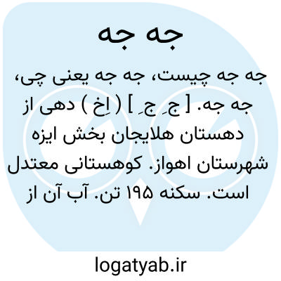 جه جه. [ ج ِ ج ِ ] ( اِخ ) دهی از دهستان هلایجان بخش ایزه شهرستان اهواز. کوهستانی معتدل است. سکنه 195 تن. آب آن از چشمه و محصول آن غلات و شغل اهالی زراعت است. راه مالرو دارد. ( از فرهنگ جغرافیائی ایران ج 6 ).