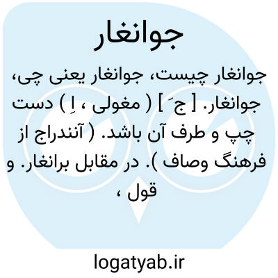 جوانغار. [ ج َ ] ( مغولی، اِ ) دست چپ و طرف آن باشد. ( آنندراج از فرهنگ وصاف ). در مقابل برانغار. و قول، یکی از سه قسمت لشکر است در میدان جنگ بزبان مغولی. میسره. جانب دست چپ. ( یادداشت بخطمرحوم دهخدا ): بتعبیه سپاه پرداخت و ضبط برانغار را به اهتمام امیرزاده... و دیگر امراء ظفرپناه بازگذاشت و در جوانغار سلطان محمودخان و... و امراء عالیشان را بازداشت و قول را از فر طلعت همایون زیب و زینت داده و... ( حبیب السیر چ سنگی تهران ج 2 ص 158 ).
