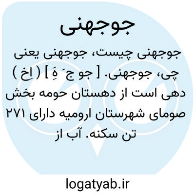 جوجهنی. [ جو ج َ هَِ ] ( اِخ ) دهی است از دهستان حومه بخش صومای شهرستان ارومیه دارای 271 تن سکنه. آب از چشمه و محصول غلات و توتون و شغل اهالی زراعت و گله داری و صنایع دستی جاجیم بافی است. ( از فرهنگ جغرافیایی ایران ج 4 ).