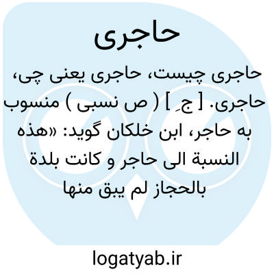 حاجری. [ ج ِ ] ( ص نسبی ) منسوب به حاجر، ابن خلکان گوید: «هذه النسبة الی حاجر و کانت بلدة بالحجاز لم یبق منها سوی الآثار...» از کسانی که بدین نسبت معروف اند عیسی بن سنجربن بهرام... آتی الذکر است. رجوع به وفیات الاعیان ابن خلکان چ طهران ج 1 ص 436 شود.