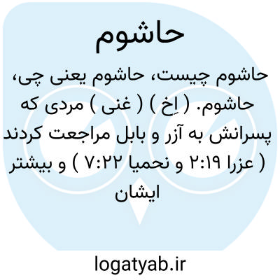 حاشوم. ( اِخ ) ( غنی ) مردی که پسرانش به آزر و بابل مراجعت کردند ( عزرا 2:19 و نحمیا 7:22 ) و بیشتر ایشان زنان غریبه در حباله نکاح داشتند ( عزرا 10:33 ) و وکیلان ایشان عهدنامه را مهر کردند. ( قاموس مقدس ). یکی از آنانکه بطرف چپ عزرا ایستاده عزرا خود بخواندن شریعت مشغول بود ( نحمیا 8:4 ) ( قاموس کتاب مقدس ).