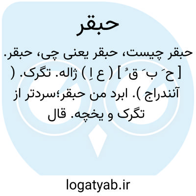 حبقر. [ ح َ ب َ ق ُ ] ( ع اِ ) ژاله. تگرک. ( آنندراج ). ابرد من حبقر؛سردتر از تگرک و یخچه. قال مجدالدین ذکروه فی الأبنیة و لم یفسروه و معناه البرد. حب الغمام. یقال: ابرد من حبقر، و یقال: عَبقُر و اصله حب قرّ، و القر البرد، و الدلیل علی ما ذکرته أن اباعمروبن العلاء یرویه: أبرد من عب قر و العب اسم للبرد. ( منتهی الارب ).