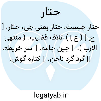 حتار. [ ح ِ ] ( ع اِ ) غلاف قضیب. ( منتهی الارب ). || چین جامه. || سر خریطه. || گرداگرد ناخن. || کناره گوش. حتار اُذُن؛ گرداگرد گوش. || هرچه فراز گیرد چیزی را گرد وی. ج، حُتر. || حلقه دُبُر یا آنچه ما بین دُبُر و قبل است یا خطی که میان خصیتین است. || آب چشم. || گرداگرد چشم. || گوشتی مانند دندان نیش دراقصای دهان شتر. || حلقه های رسن در کناره های خرگاه که طنابها را بدان بندند. ( منتهی الارب ).