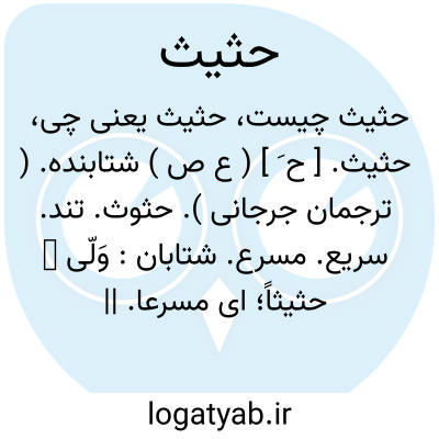 حثیث. [ ح َ ] ( ع ص ) شتابنده. ( ترجمان جرجانی ). حثوث. تند. سریع. مسرع. شتابان: وَلّی ̍ حثیثاً؛ ای مسرعا. || حریص. ج، حِثاث. ( منتهی الارب ).