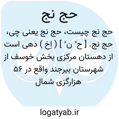 حج نج. [ ح ُ ن ُ ] ( اِخ ) دهی است از دهستان مرکزی بخش خوسف از شهرستان بیرجند واقع در 56 هزارگزی شمال باختری خوسف. جلگه و گرمسیر است. دارای قنات و غلات و شغل اهالی زراعت، کرباس بافی و مالداری است. ( فرهنگ جغرافیائی ایران ج 9 ).