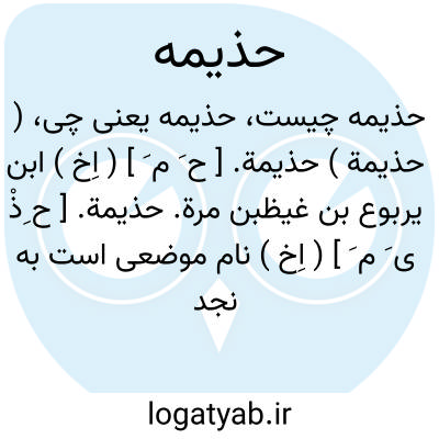 لغت نامه دهخدا ( حذیمة ) حذیمة. [ ح َ م َ ] ( اِخ ) ابن یربوع بن غیظبن مرة.حذیمة. [ ح ِذْ ی َ م َ ] ( اِخ ) نام موضعی است به نجد و بدانجا یکی از جنگهای عرب روی داده است. ( مراصد الاطلاع ص 130 ).