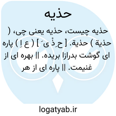 ( حذیة ) حذیة. [ ح ِذْ ی َ ] ( ع اِ ) پاره ای گوشت بدرازا بریده. || بهره ای از غنیمت. || پاره ای از هر چیزی. و در حدیث است: انها [ ای فاطمة ( ع ) ] حذیة منی.