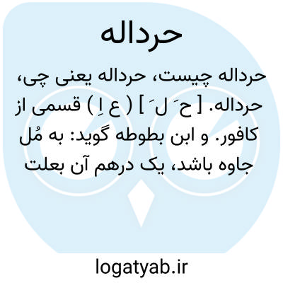 لغت نامه دهخدا حرداله. [ ح َ ل َ ] ( ع اِ ) قسمی از کافور. و ابن بطوطه گوید: به مُل جاوه باشد، یک درهم آن بعلت بسیاری برودت بکشد و گوید بپای نی آن خون آدمی یا فیلی خرد ریزند تا کافور در آن نی گرد شود. ( ترجمه سفرنامه ابن بطوطه ص 655 ).