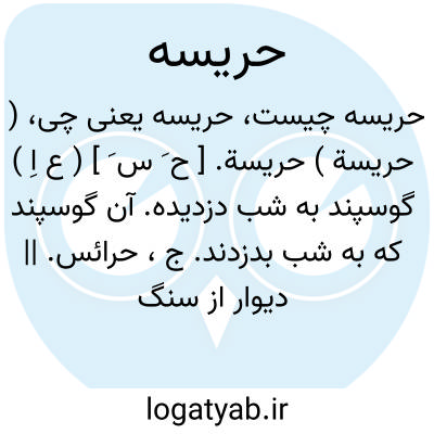 ( حریسة ) حریسة. [ ح َ س َ ] ( ع اِ ) گوسپند به شب دزدیده. آن گوسپند که به شب بدزدند. ج، حرائس. || دیوار از سنگ که برای گوسپندان سازند.