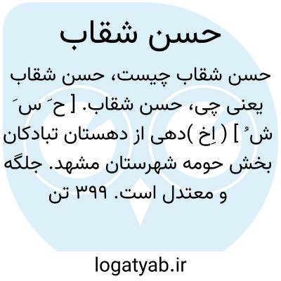 حسن شقاب. [ ح َ س َ ش ُ ] ( اِخ )دهی از دهستان تبادکان بخش حومه شهرستان مشهد. جلگه و معتدل است. 399 تن سکنه شیعه فارسی زبان دارد. آب آن از قنات و محصول آن غلات، بنشن و شغل اهالی زراعت و مالداری است. ( از فرهنگ جغرافیائی ایران ج 9 ).